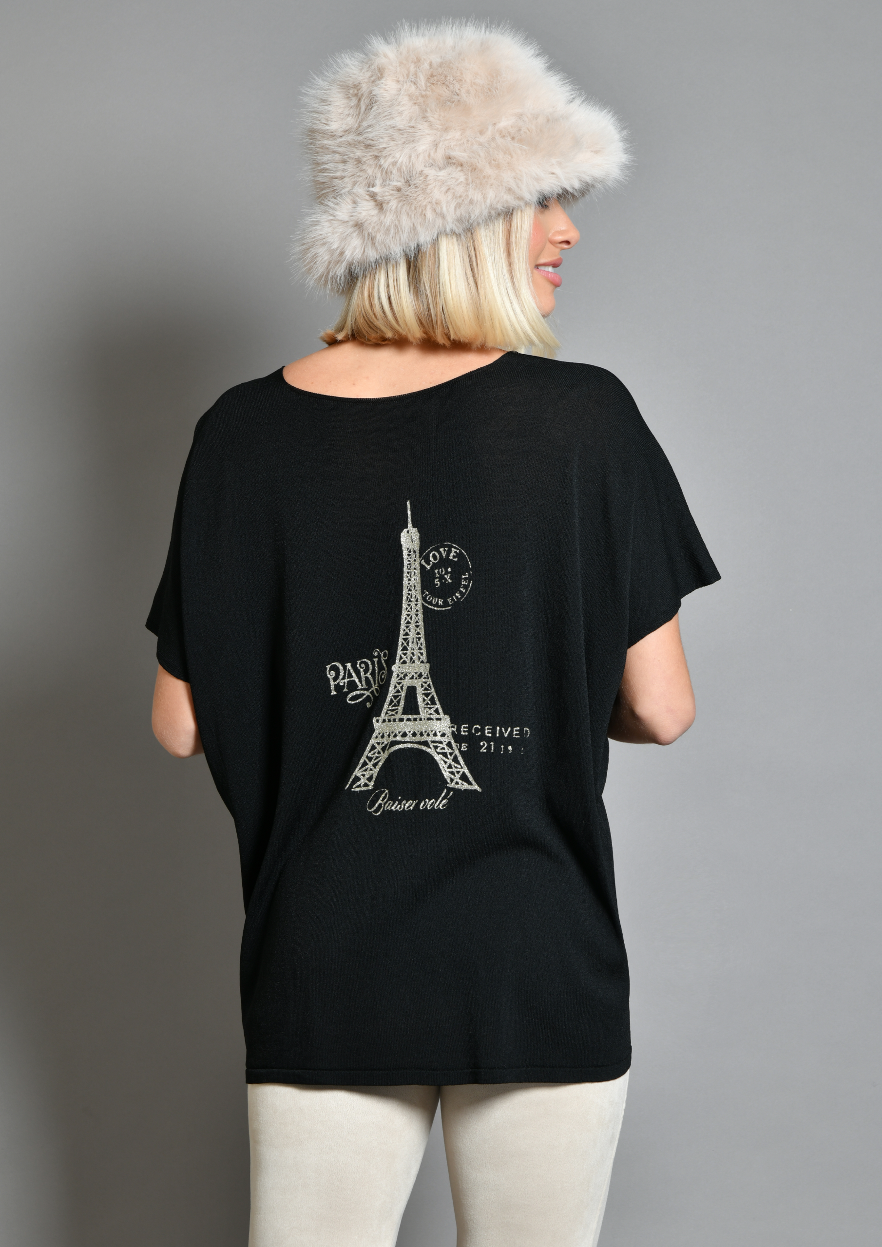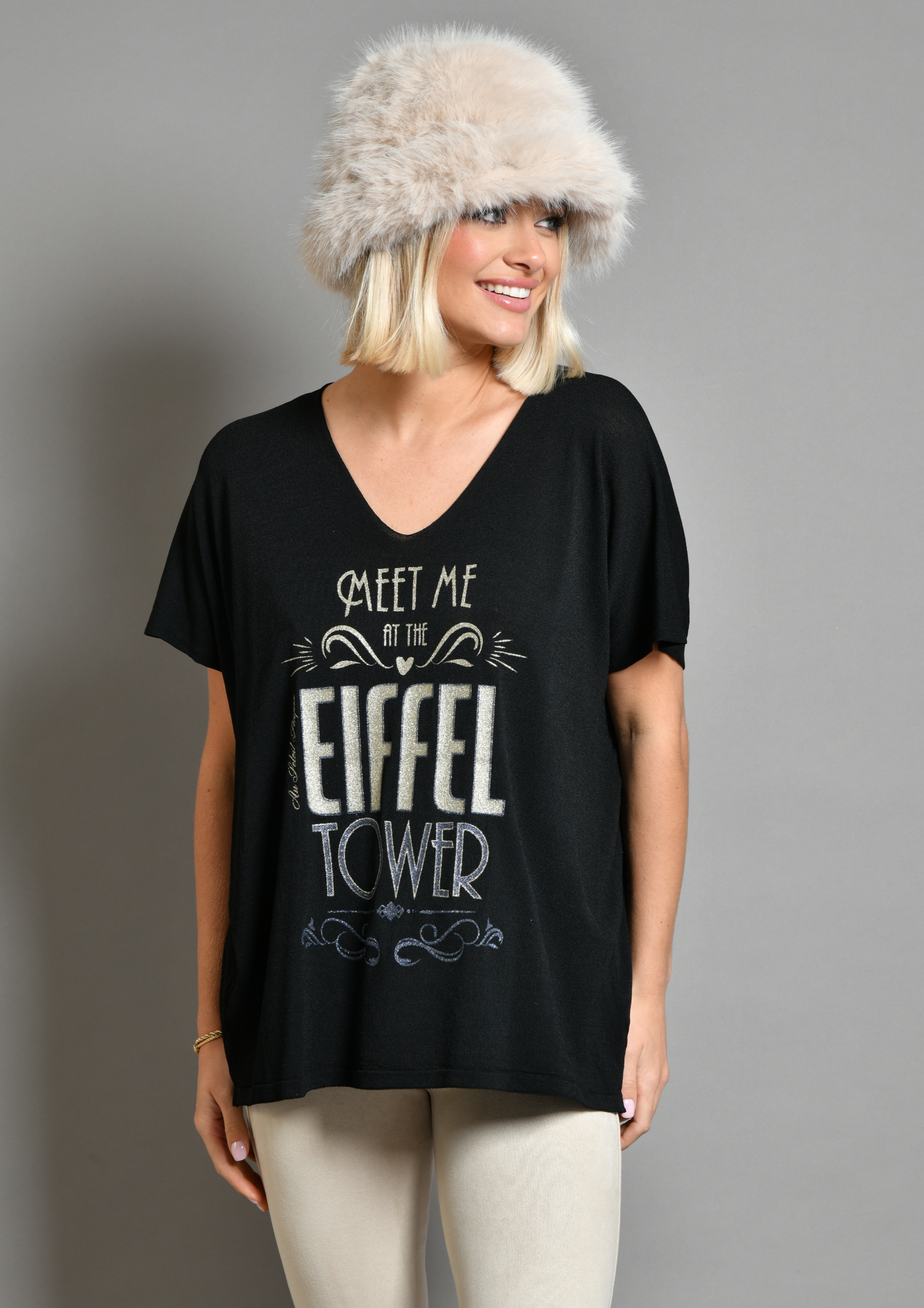 Pull Elysée Meet Me at the Eiffel Tower . Noir . Col V Basic . Manches courtes . Hiver 2024 . TU